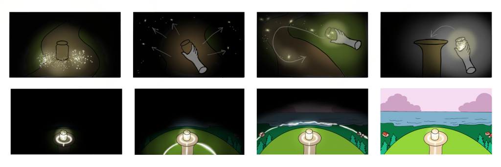 Various fireflies are scattered around the space. The user is introduced to the game mechanics. There is a Jar and the user can either catch the fireflies and put it in the Jar or they can just use the jar to collect them.