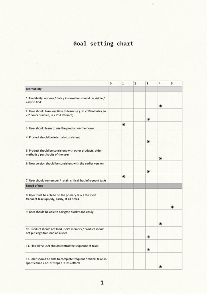 Using the goal setting sheet, mark from 0 – 5, Note down the 5’s and 4’s and select one or two as primary usability goals.