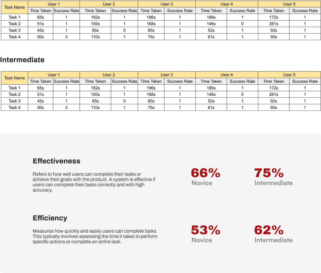Effectiveness & Effectivity for the previous 4 tasks
