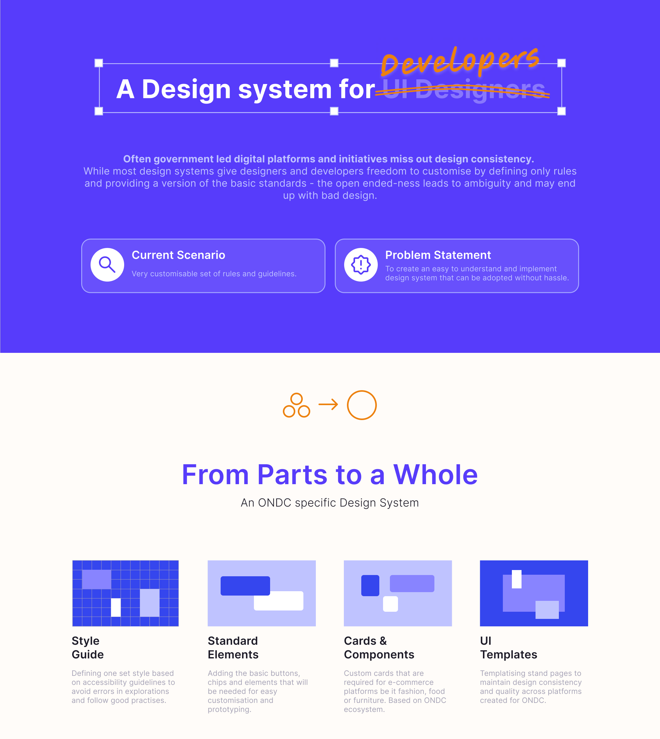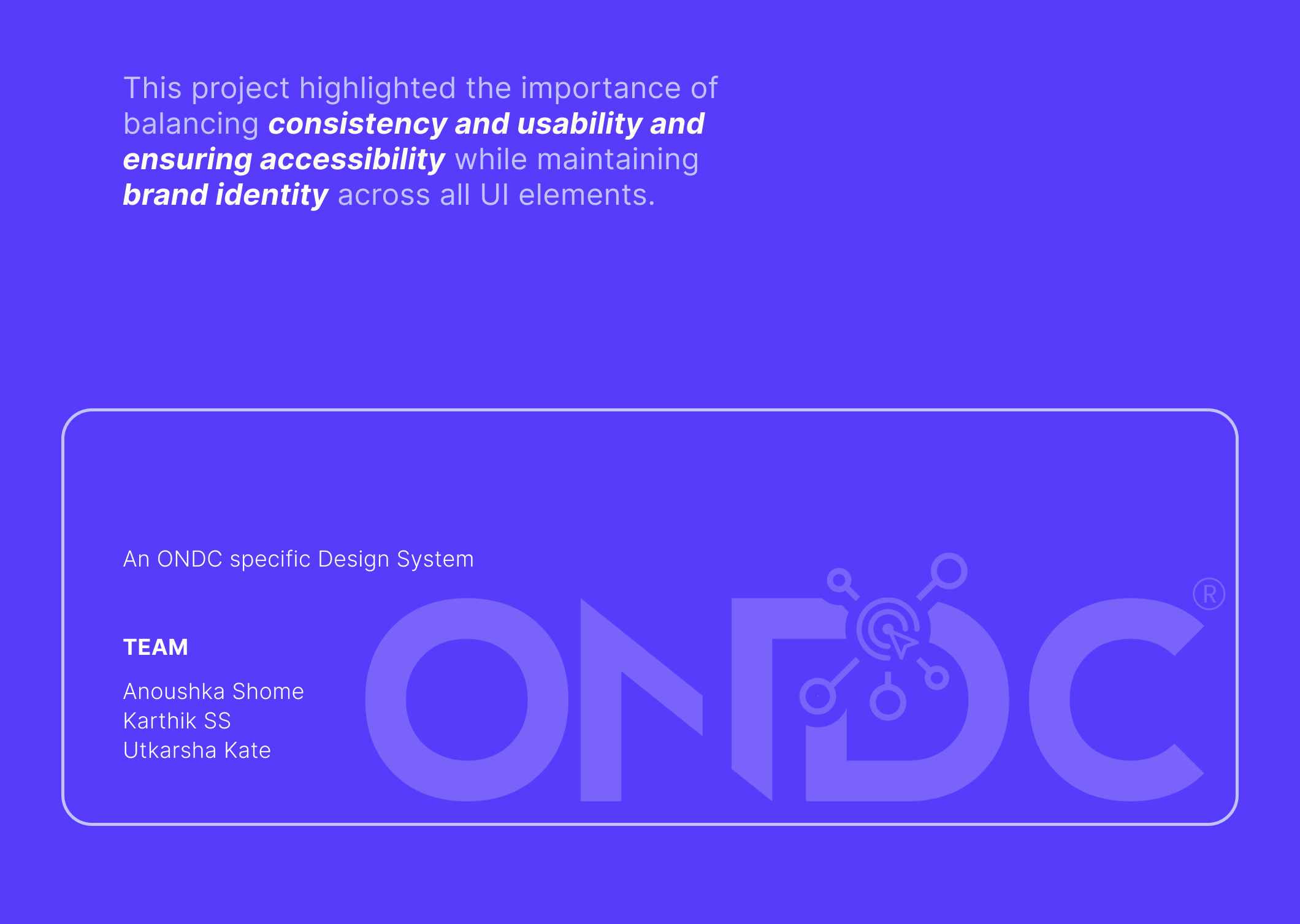 In many government-led digital platforms, design consistency often takes a back seat. While most design systems give designers and developers broad freedom by defining only rules and base standards, this openness frequently leads to ambiguity and inconsistent results. During this project, I explored how a design system could be built specifically for developers, not just for UI designers. This is to ensure better adoption, consistency, and accessibility across the ONDC (Open Network for Digital Commerce) ecosystem.